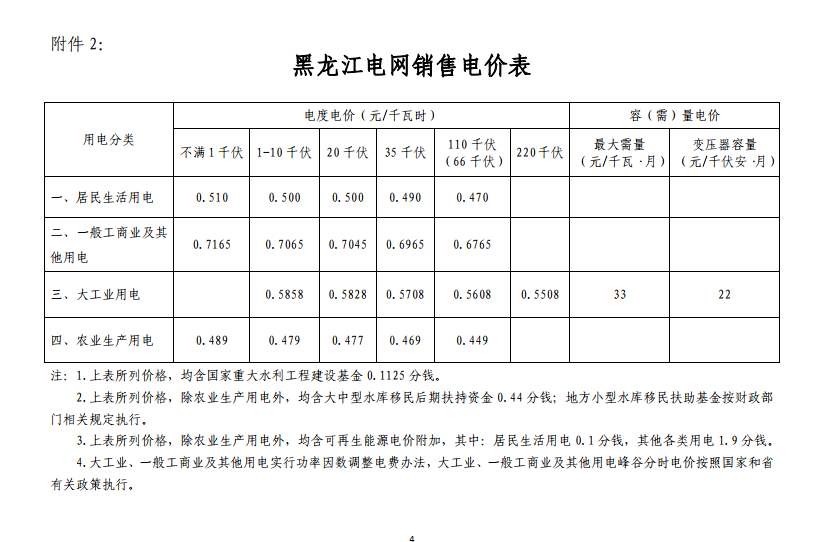 附件:1.黑龙江电网输配电价表 2.黑龙江电网销售电价表