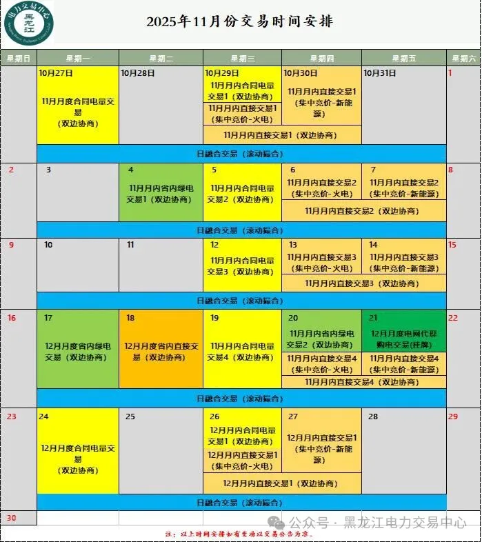 黑龙江2025年11月份省内电力市场化交易时间安排